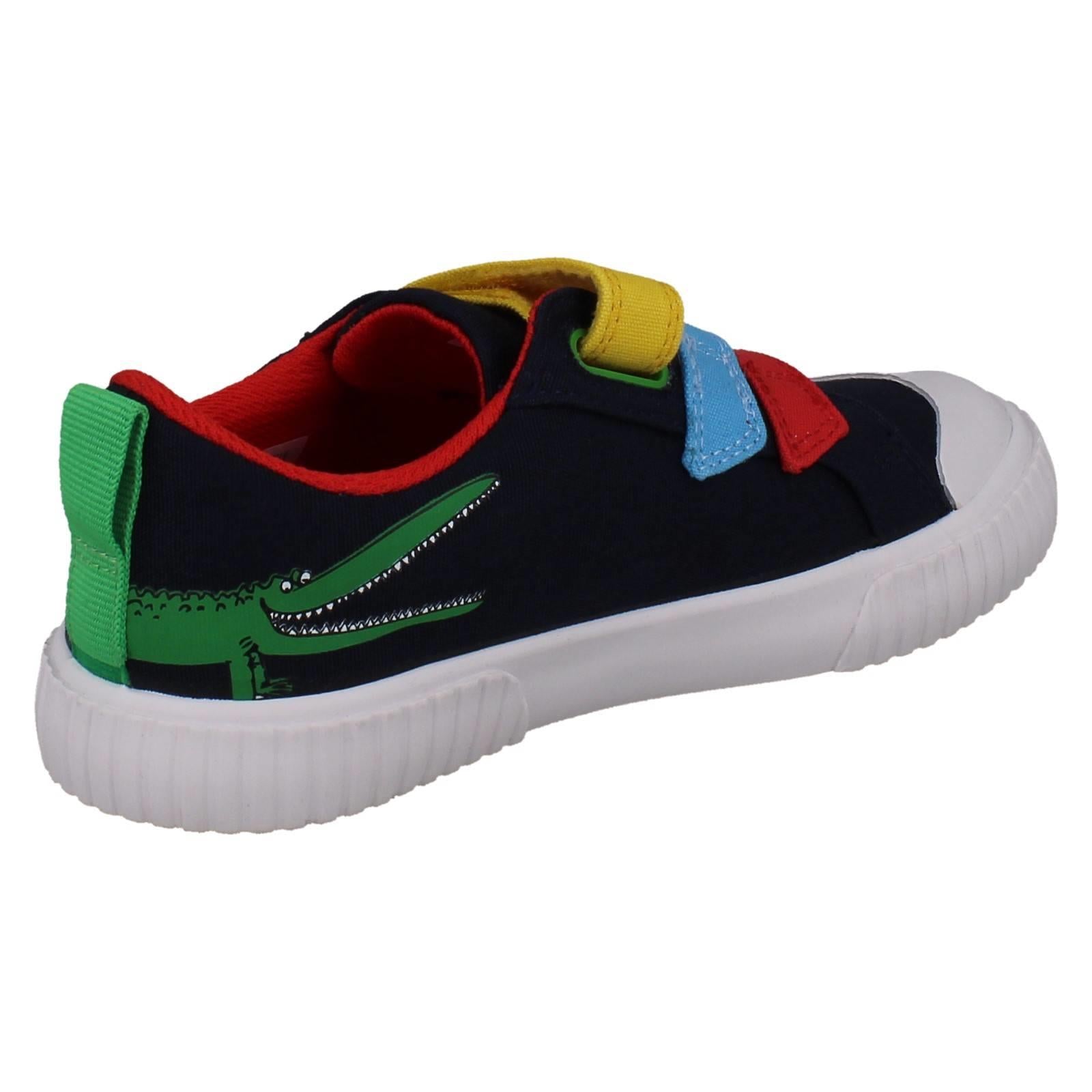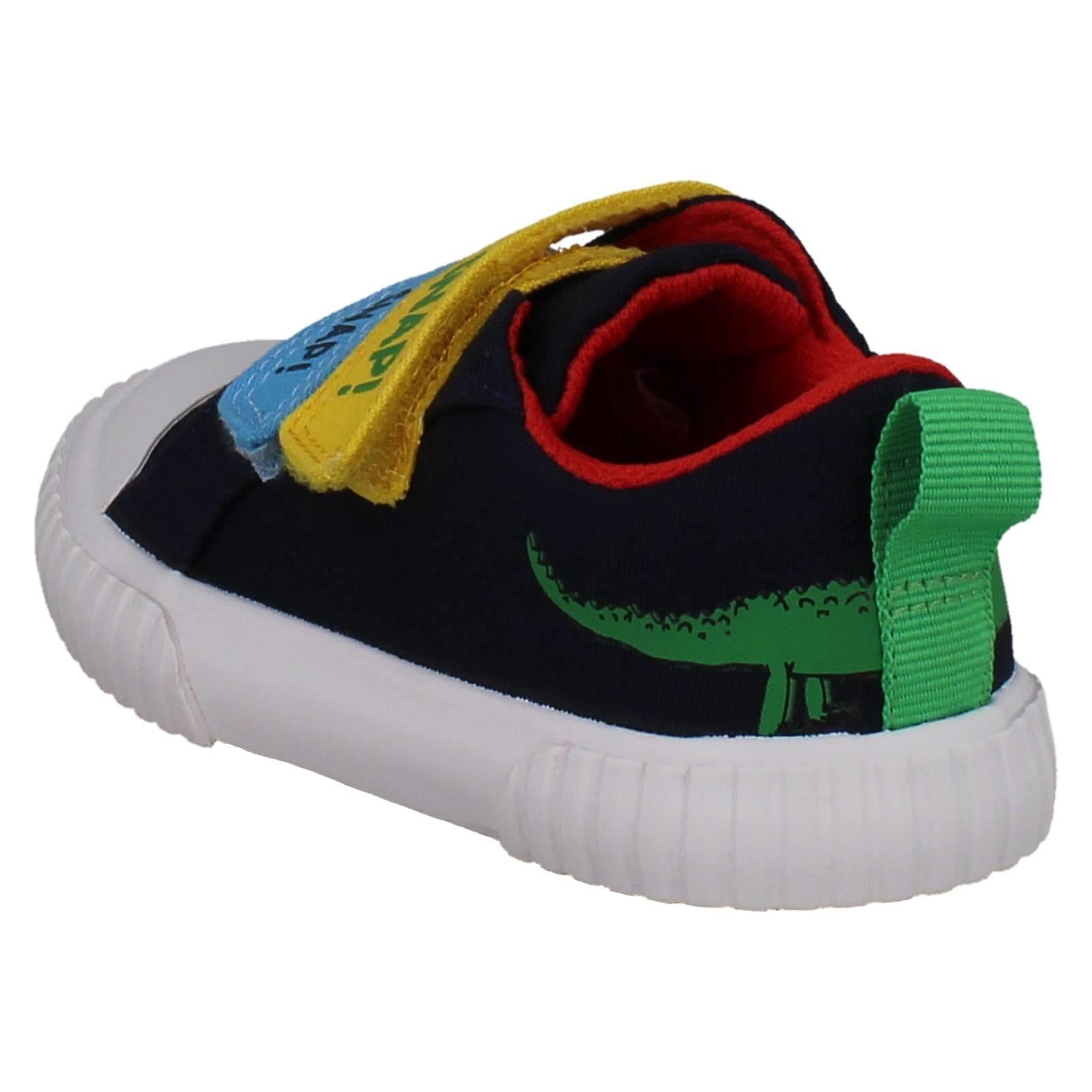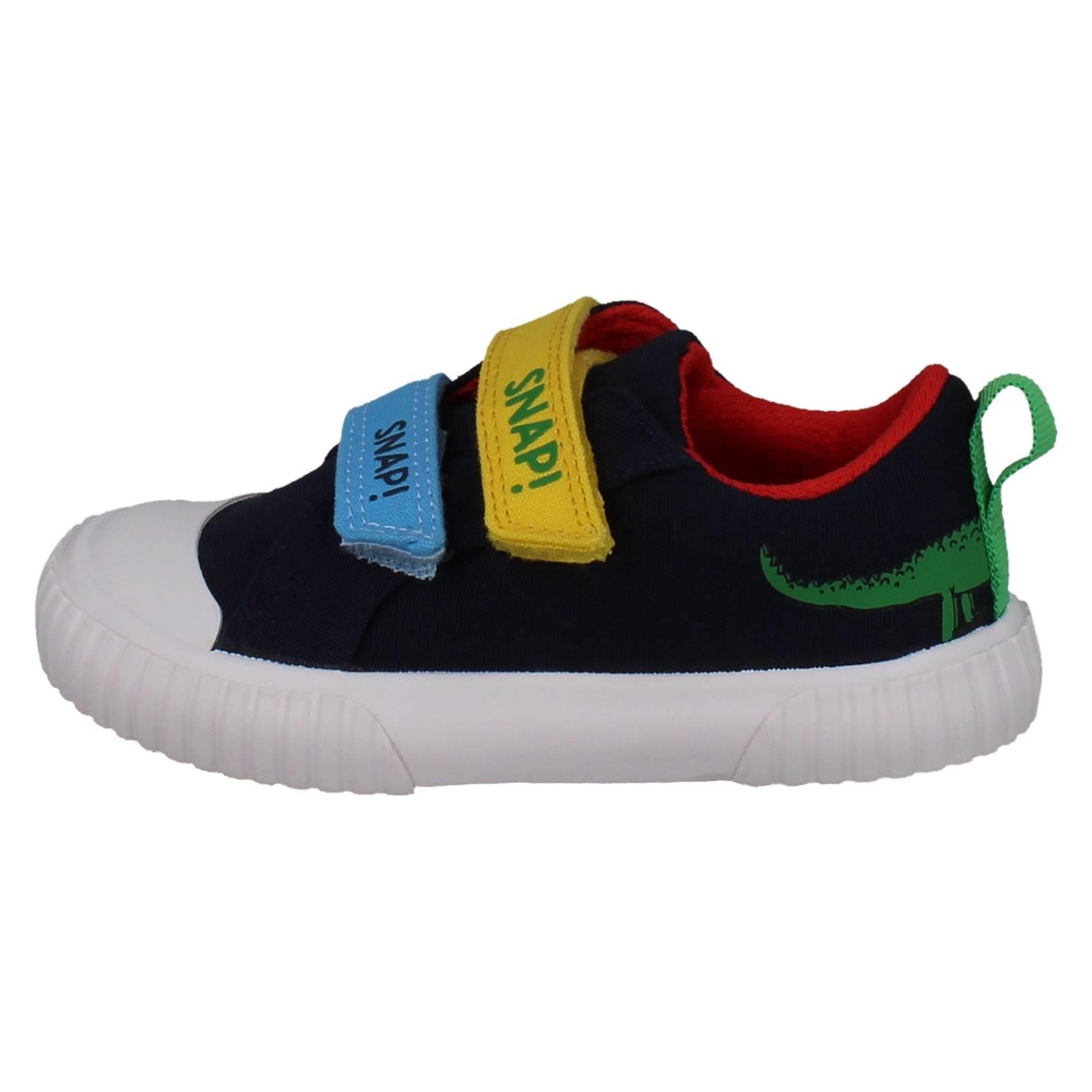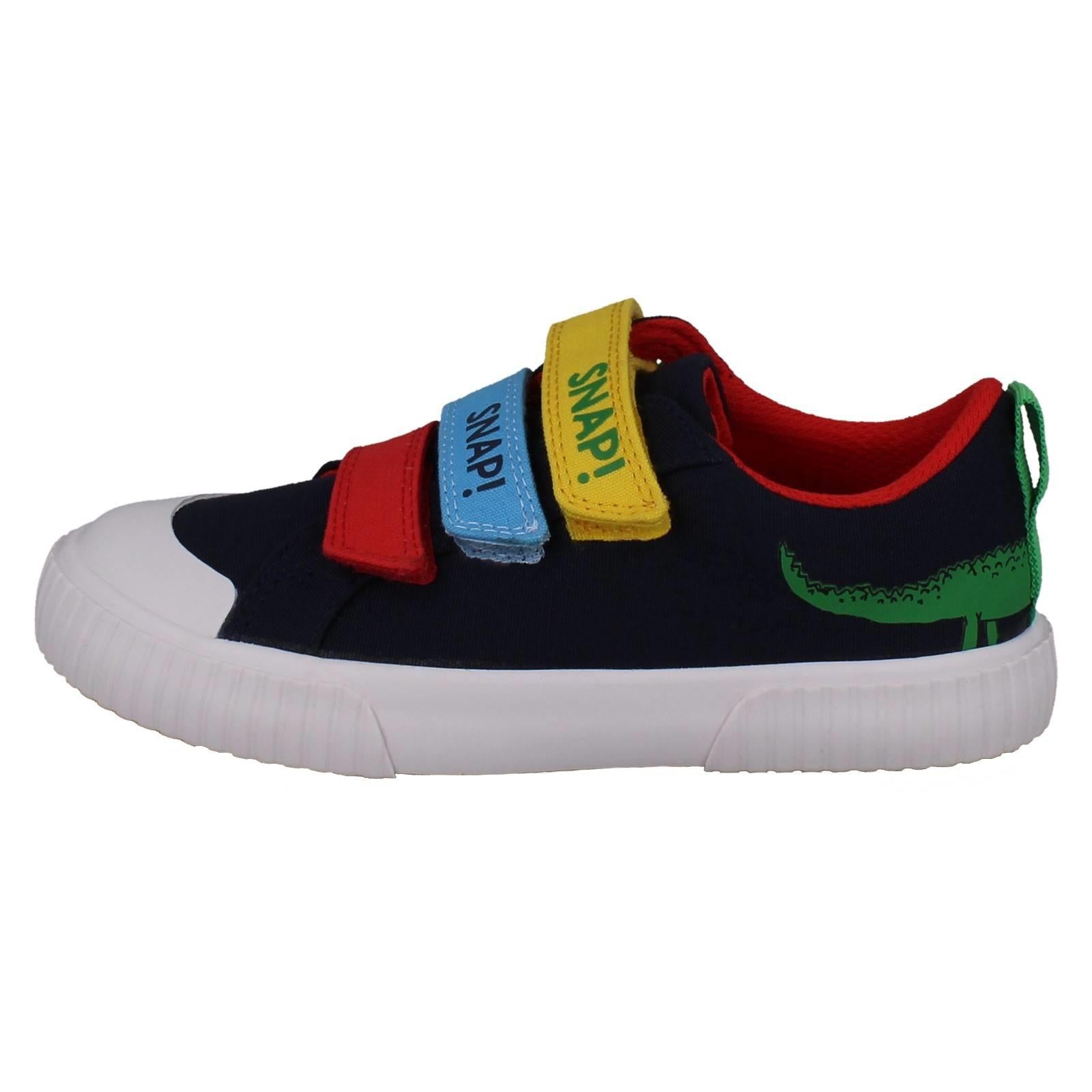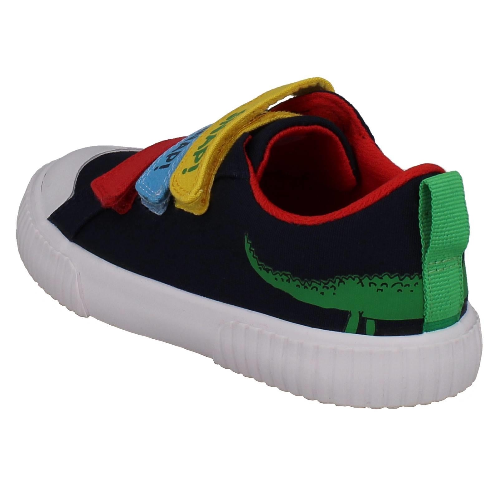 Clarks boys' canvas shoes invite imaginative play! Unleash 'The Enormous Crocodile' adventures with every step. Textile uppers cushion growing feet while the hook and loop fastening secures fast movements, perfect for playground exploration. Watch them SNAP! MUNCH! CRUNCH! through their day in these colourful, action-ready trainers. Give them the freedom to explore wilder worlds.