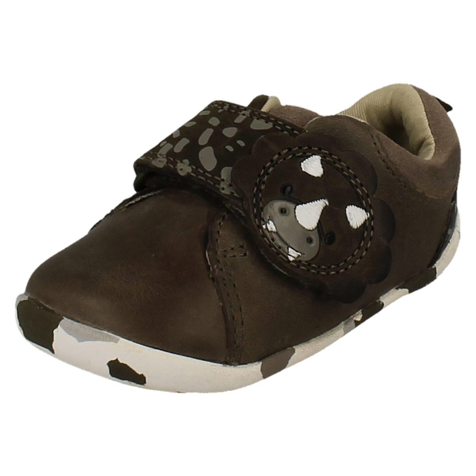 Clarks Boys Casual First Shoes Roamer Tri T unleash imagination with every stomp! These leather-upper shoes feature a playful dinosaur detail and a secure hook and loop fastening, empowering tiny explorers to conquer the playground with confidence. Textile linings and a synthetic sole cushion little feet as they adventure.