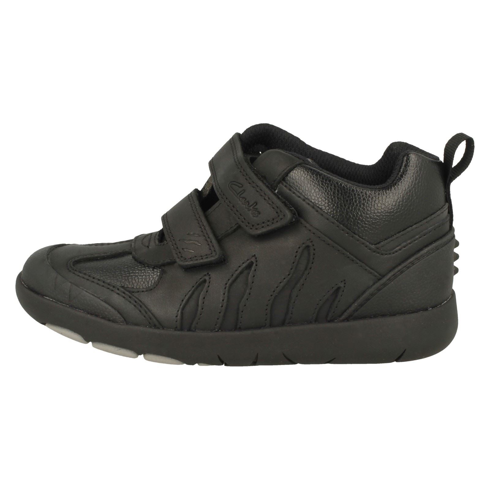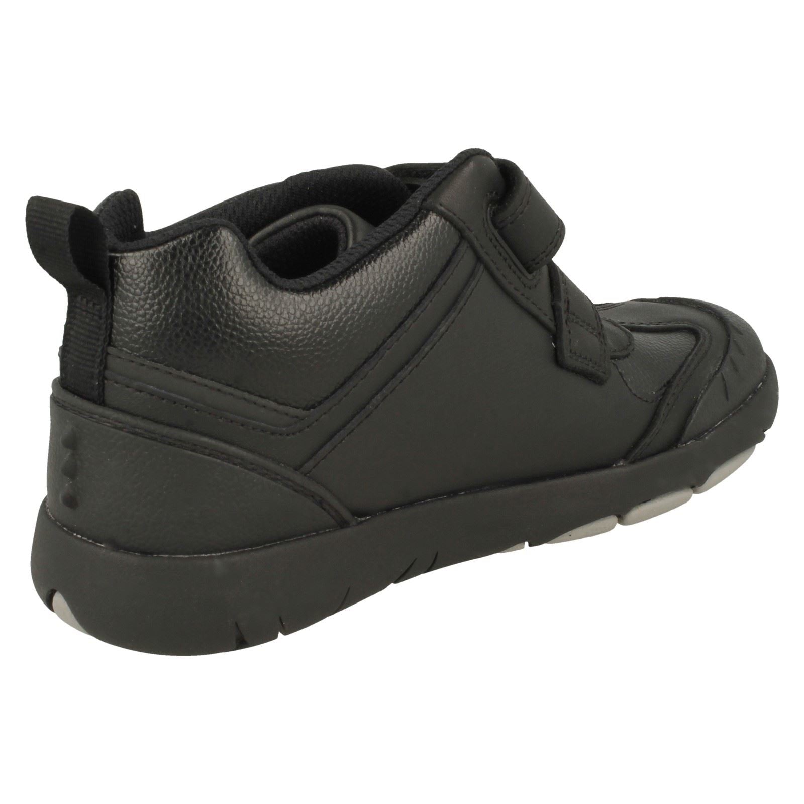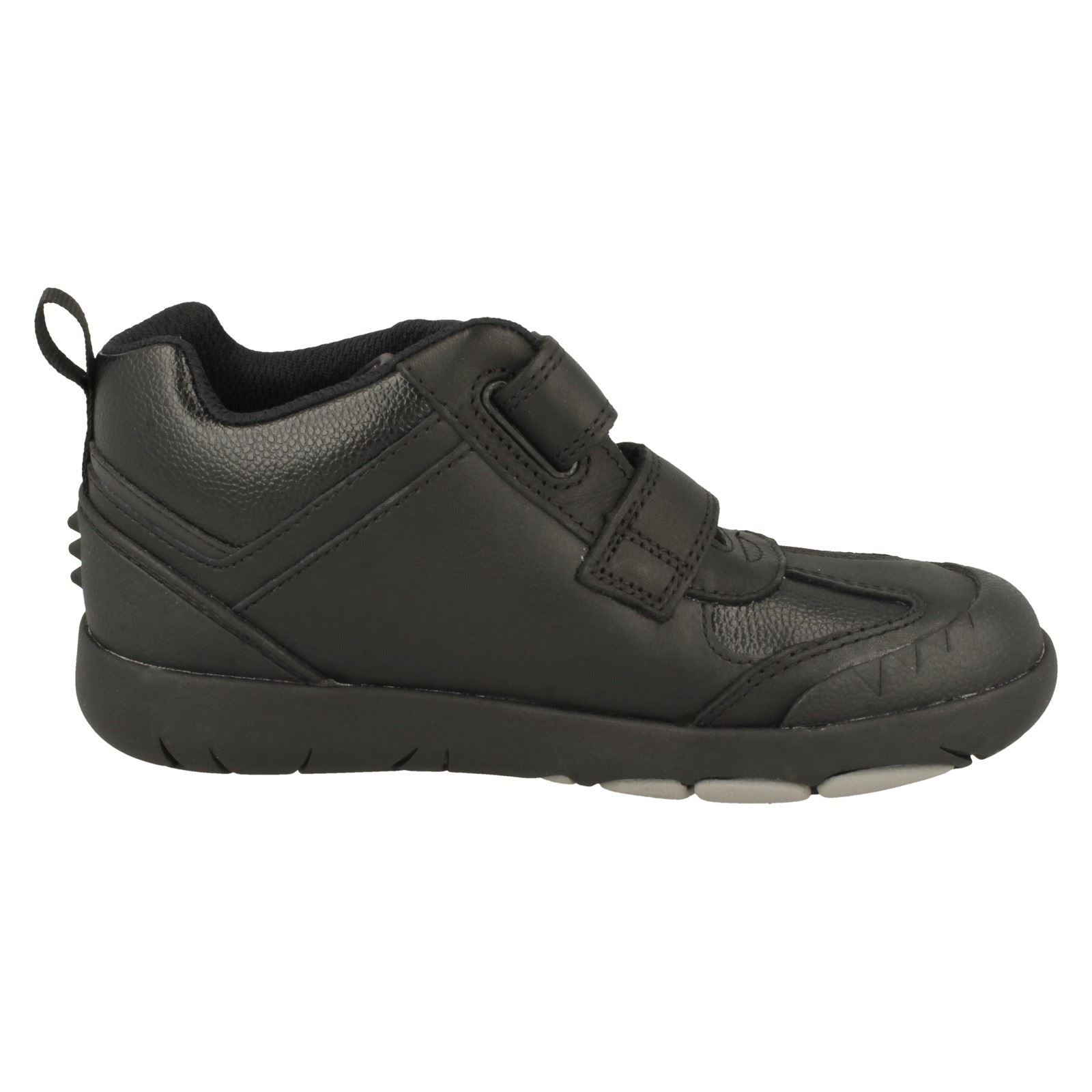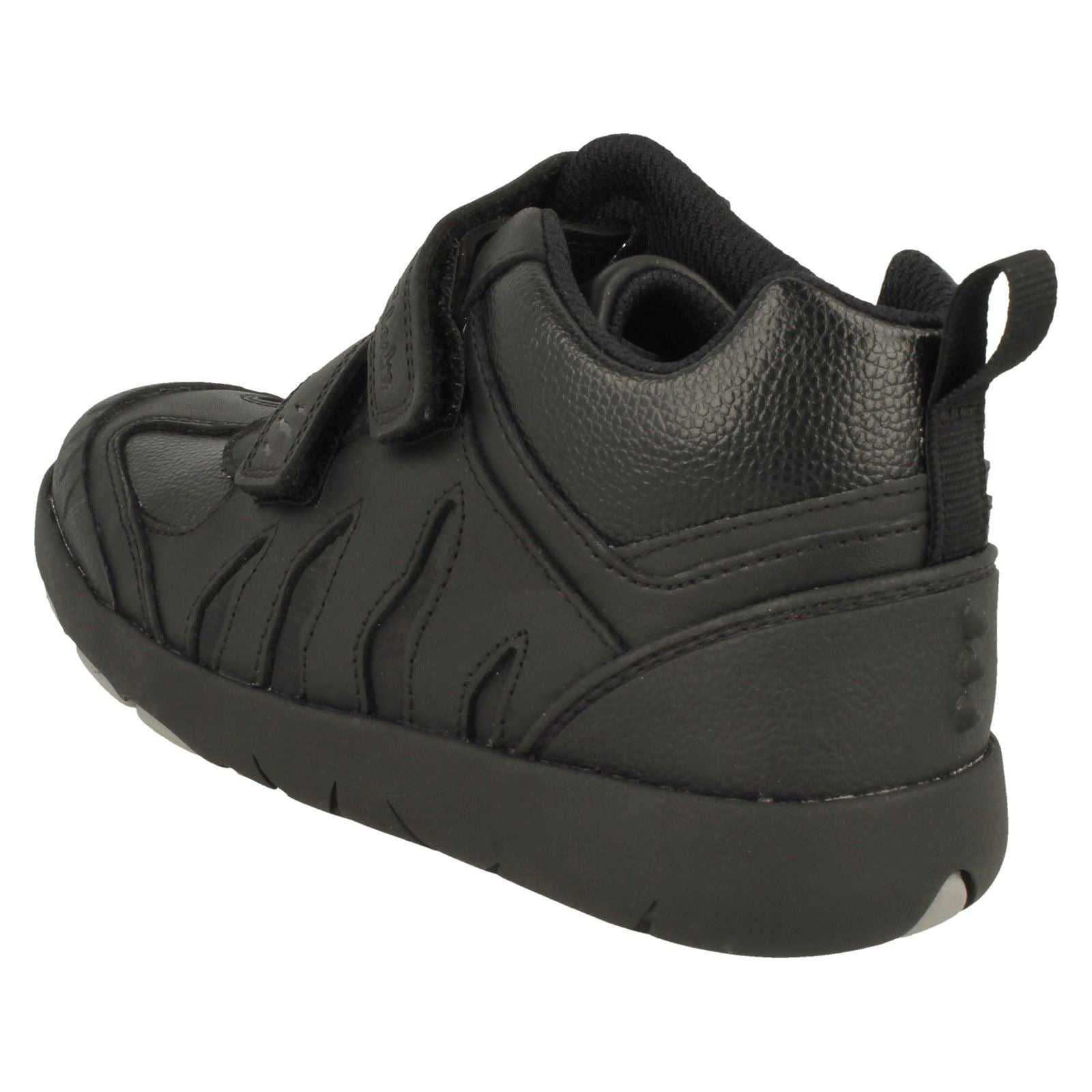 Clarks Rex Hop K boots let little explorers conquer the playground! These boys' ankle boots feature a tough leather and synthetic upper and textile lining for comfort that lasts all day, ideal for school wear. The synthetic sole provides reliable grip while the easy hook and loop fastening empowers independence. Watch him stomp, leap, and roar into every adventure!