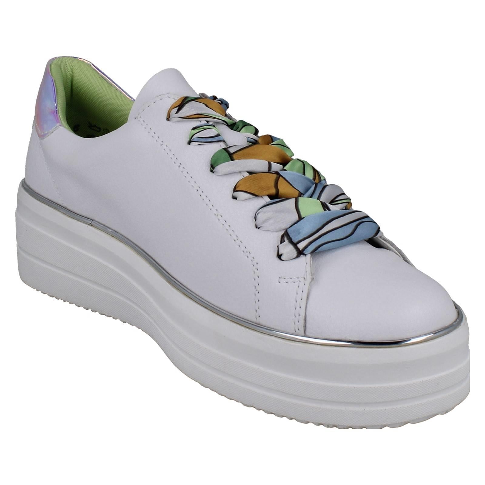 Remonte Ladies Leather Scarf Lace Platform Trainers D1C06: Revolutionise your stride with this luxe leather sneaker. Unbox instant style and enjoy blissful comfort, thanks to the cushioned canvas inner and removable insoles. The unique scarf laces elevate your everyday look. Step up, lace up, and conquer the day with confidence and ease!