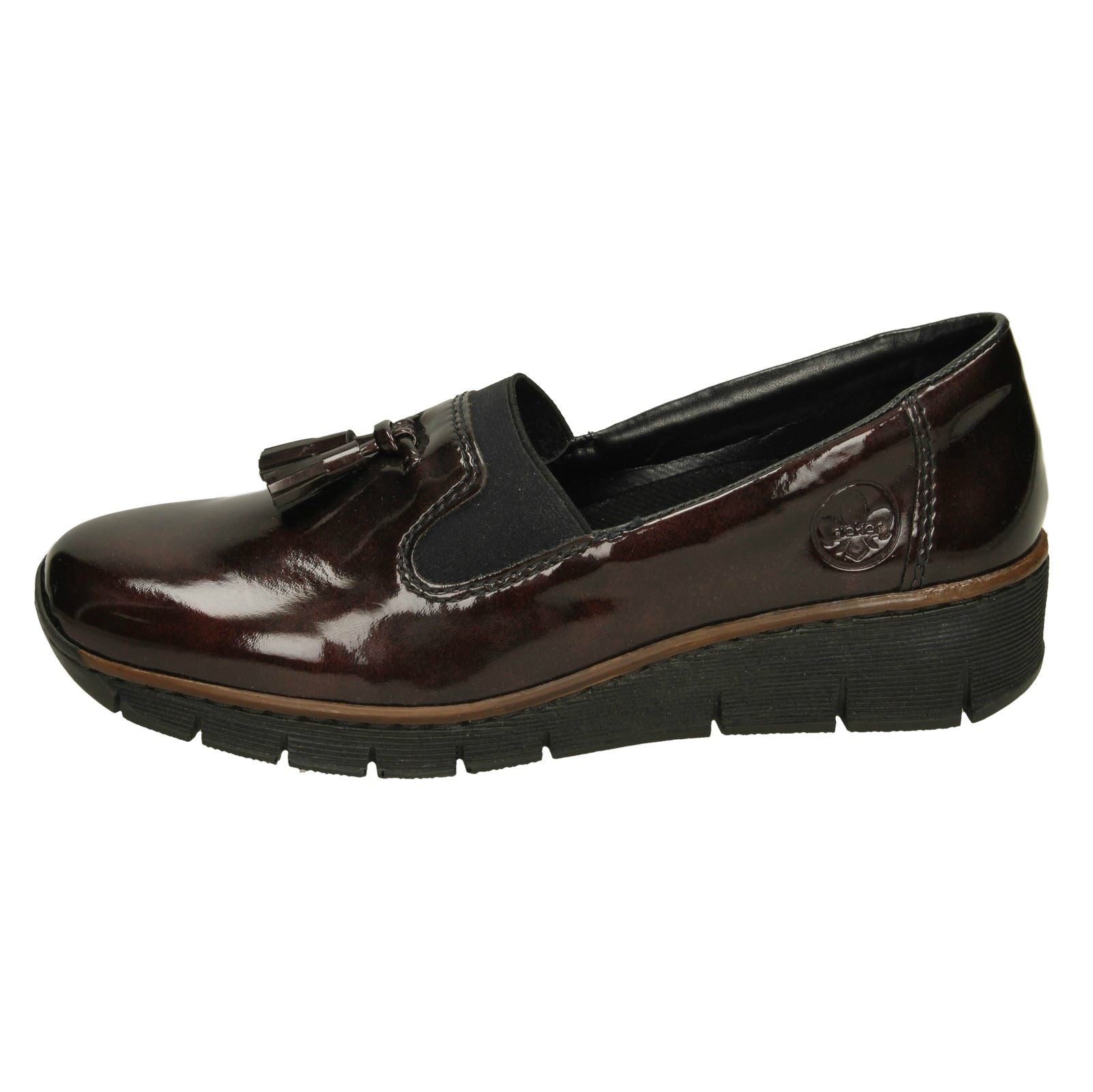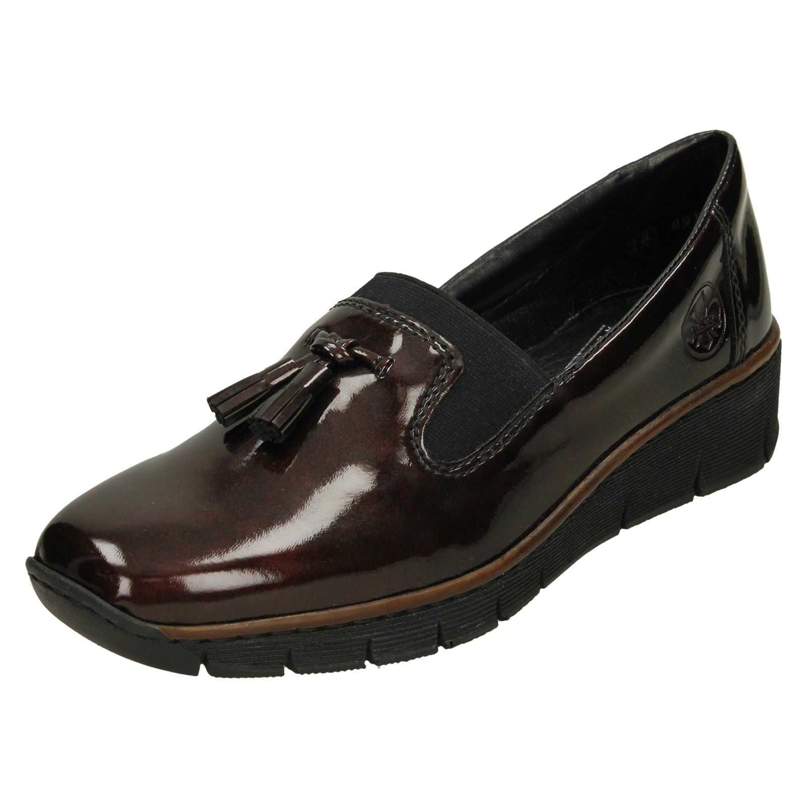 Glide into any formal affair with effortless poise. **Rieker** delivers ultimate comfort and sharp style in these patent slip-on wedges. The sleek upper catches the light, while a playful tassel detail elevates your look. This dress shoe assures all-day wearability without sacrificing elegance—simply step in and conquer your day.