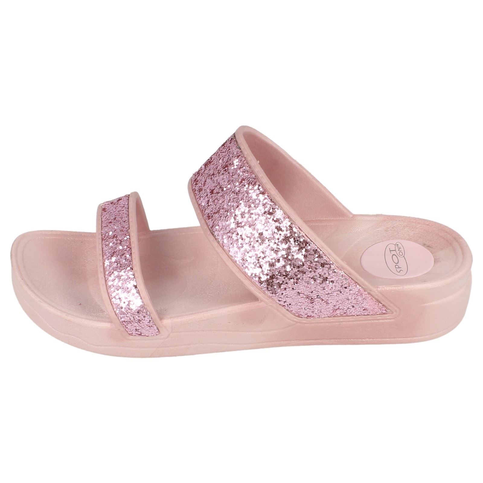 Spot On mid wedge mules elevate your summer look instantly! Slip into these sparkling two-bar glitter sandals and command attention. The lightweight synthetic design cradles your foot while the subtle wedge adds comfortable lift. Effortlessly transition from poolside chic to sunset cocktails. Embrace the joy of carefree style—your perfect holiday companion has arrived.